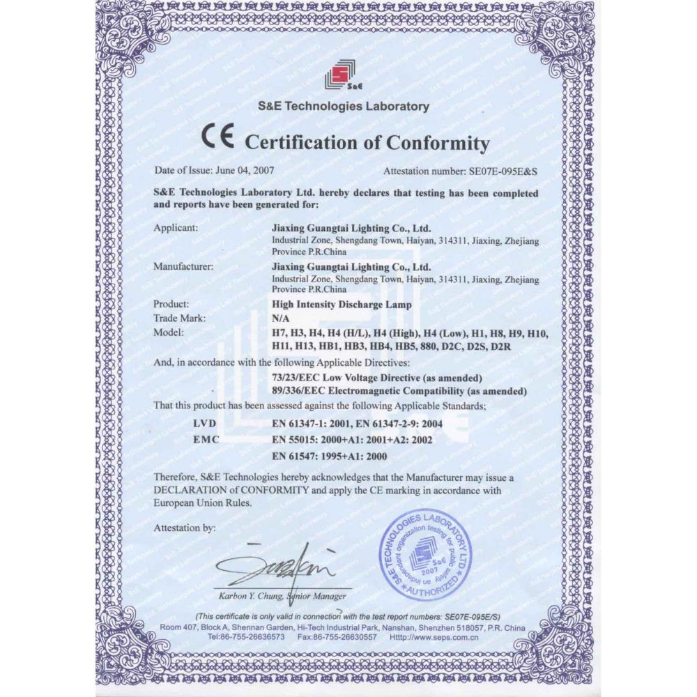 HID燈膽CE證書